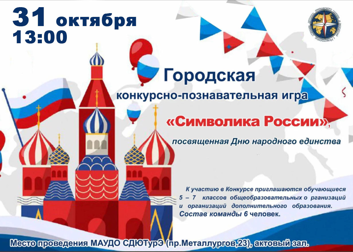 31 октября в 13.00,в здании МАУДО СДЮТурЭ (пр.Металлургов,23), актовый зал, будет проходить Городская конкурсно-познавательная игра "Символика России".