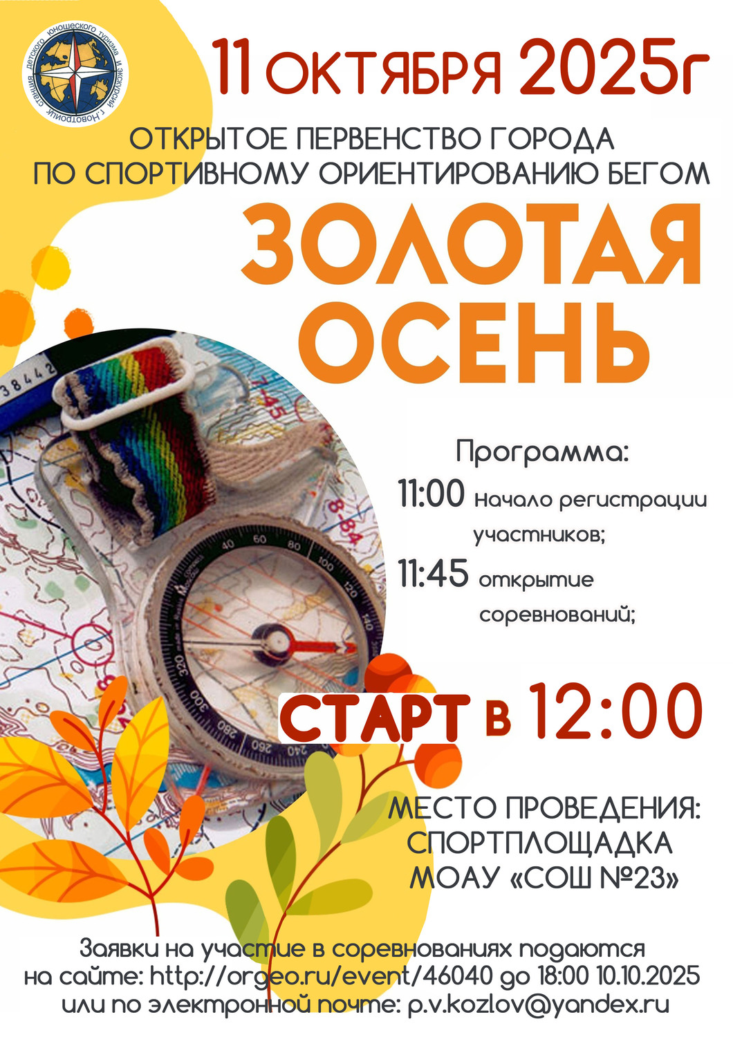 11 октября 2025 на территории СОШ № 23 и прилегающего микрорайона: ул. Уральская, пр. Металлургов и р. Разбойка. Состоится Открытое первенство города по спортивному ориентированию бегом «Золотая осень 2025». Начало стартов в 12:00.